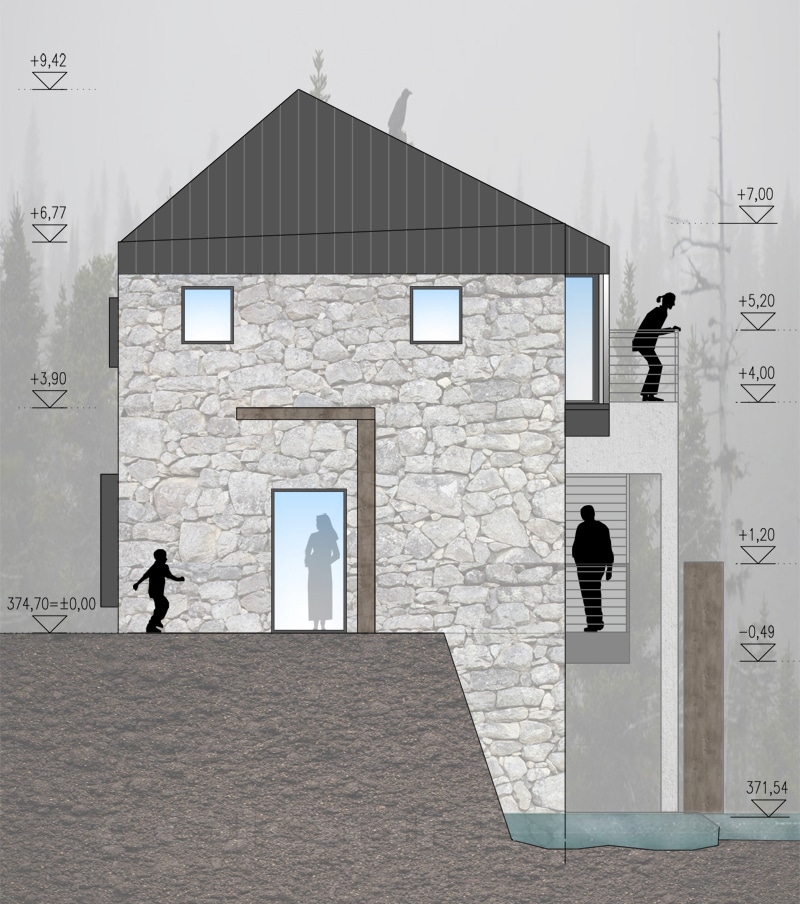 The connecting structure is a glass coated gallery elevated above the stream, in which the interior and exterior are fully permeating, as glazed surfaces on the façade, floor and roof are alternated in an irregular rhythm.